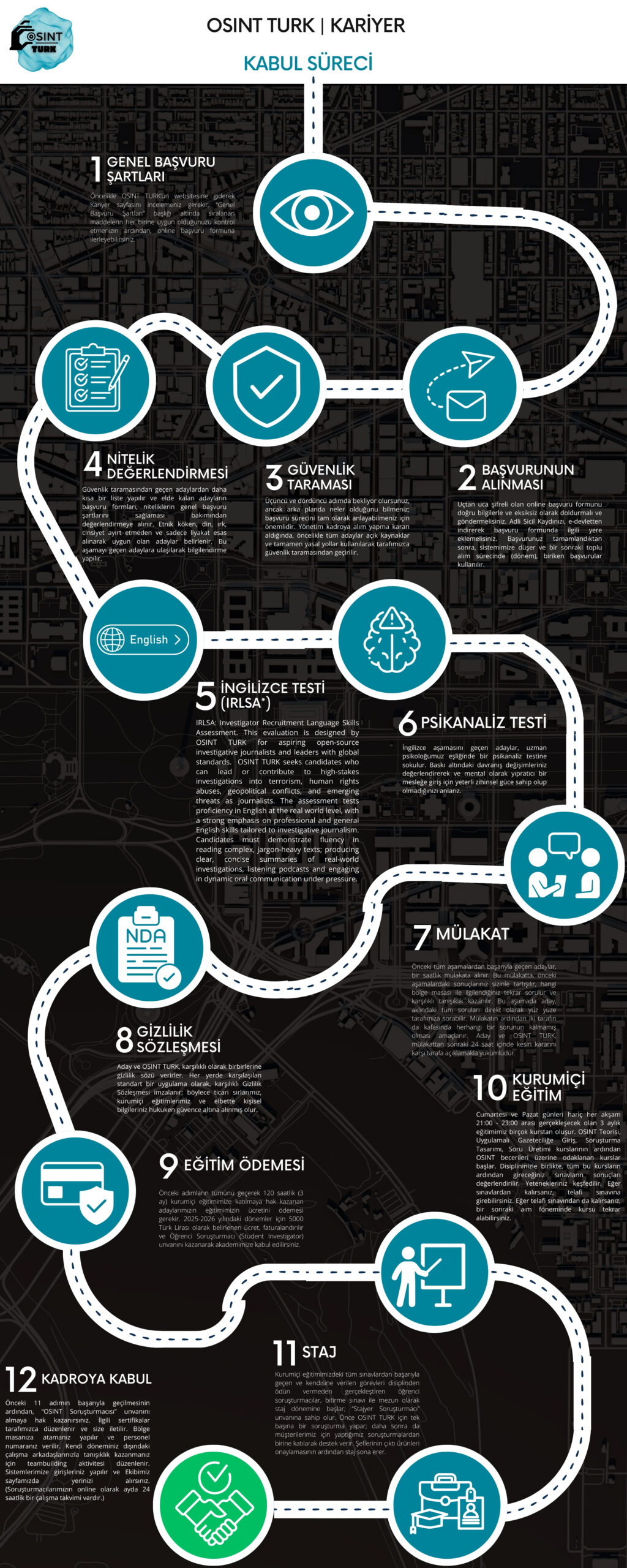 BİLGİLENDİRME: Herhangi bir adımın başarısızlığa uğraması, daha sonraki adımlara geçilmesini engeller. OSINT TURK’ün kriterlerini sağlayan ve tüm adımları başarıyla geçen soruşturmacılarımızın tamamı gönüllülük esasına göre çalışmaktadır. Ayda toplam 24 saatlik uzaktan ve esnek bir mesaiye sahip soruşturmacılarımız, her cumartesi gününe ek olarak, ayda 1 hafta tatil yaparlar. Uzaktan ve online olarak çalışılan bu pozisyon, gelecekte OSINT TURK’te yükselerek gelir elde etmek, Türkiye’nin OSINT alandaki temsiliyetine destek vermek ve giderek gelişen OSINT alanında, uluslararası standartlarda bir kariyer yapmak isteyen herkes içindir. Tüm kadromuz bu noktadan yetişmiştir.