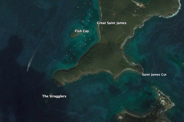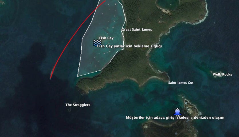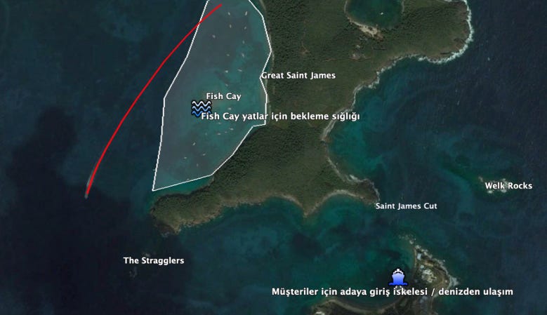 Ancak burada dikkat etmemiz gereken, Great Saint James Adası’nın ve Fish Cay’in sol tarafındaki tekne.