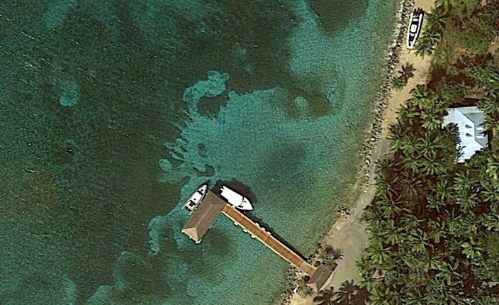 6 Şubat 2017 tarihinde çekilmiş yukarıdaki uydu görüntüsünde ise, bahsettiğimiz 10 metre uzunluğundaki görece ufak tekneler daha iyi görünüyor. Bu görselde, bu teknelerden bir tanesinin bakım için kıyıya çekek yapılmış olması, aslında bize bu teknelerin sahibinin Epstein olduğunu kanıtlıyor. Zira bu tekneler Karayip denizinde uzun seferler yapmak için oldukça küçük. Bu bağlamda, kullanım amaçlarının “misafirleri adaya getirmek” olduğunu anladığımız bu “shuttle” tekneleri, “nereden kalkıyor” olabilir? Bu sorunun yanıtı, denizdeki köpüklerde karşımıza çıkıyor.