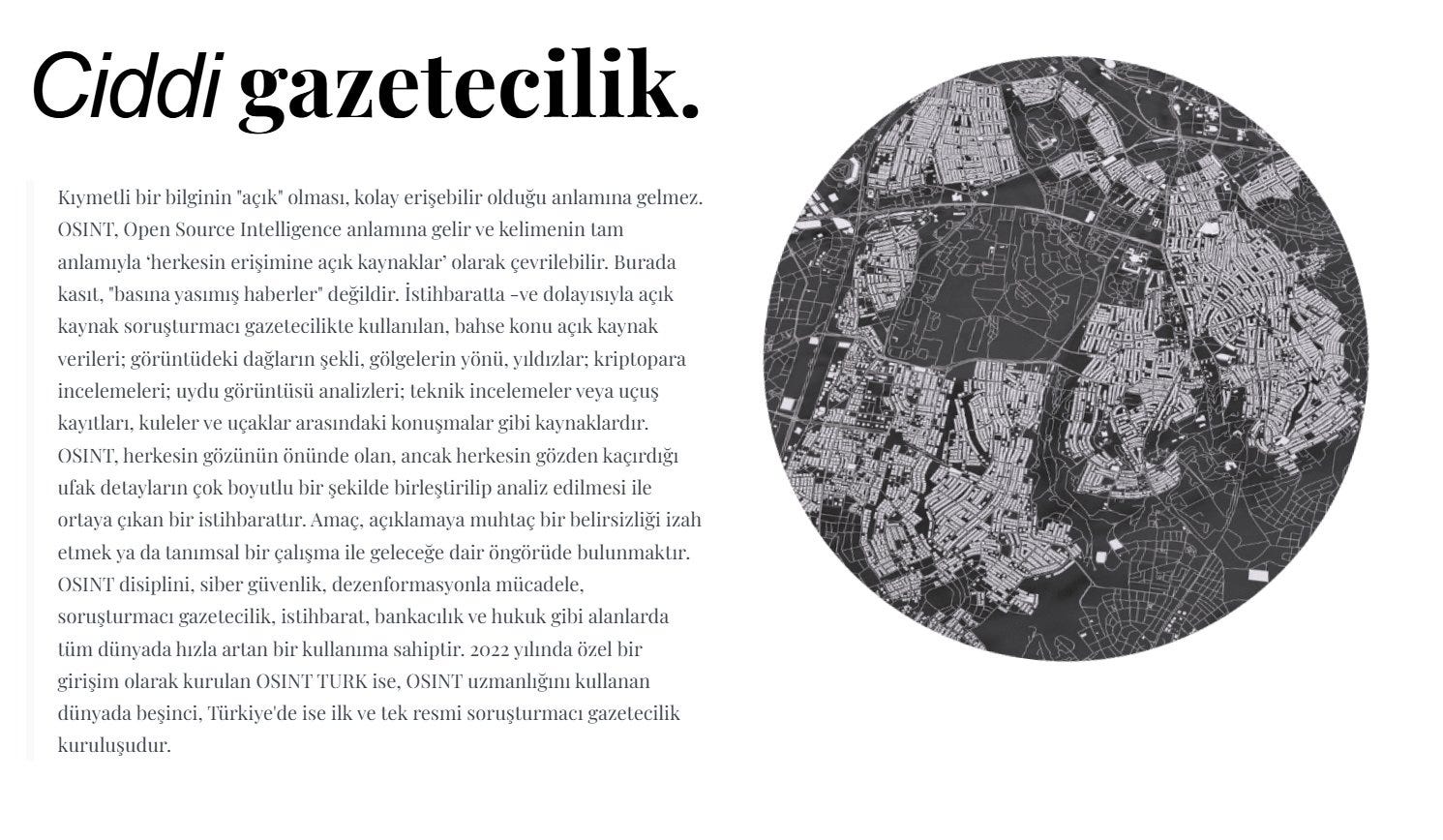 Hayalimizde, yabancı basında örneklerinin görüldüğü gibi, her türlü gizemin, herkese açık kaynaklardaki detayların analiz edildiği; ikinci el bilginin itibar görmediği; halkına yalan söylemenin neredeyse imkansız hale geldiği; gezegenin her yerinde olanlara dair kanıtlara dayalı bir algıya sahip olduğu; OSINT konusunda dünya lideri olan bir Türkiye var. Bu hayalimizi gerçekleştirmek adına 2022’den beri durmadan çalışmaktayız.