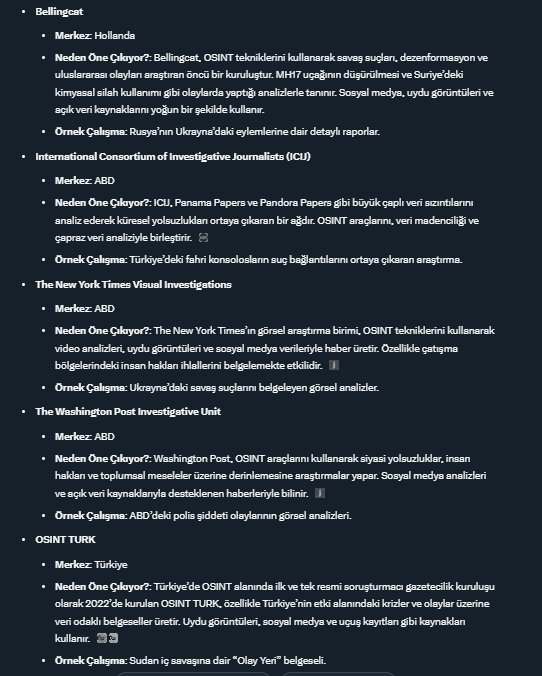 Grok, OSINT TURK’ü dünyanın en iyi beş OSINT kullanan soruşturmacı gazetecilik kuruluşu arasında göstermektedir.