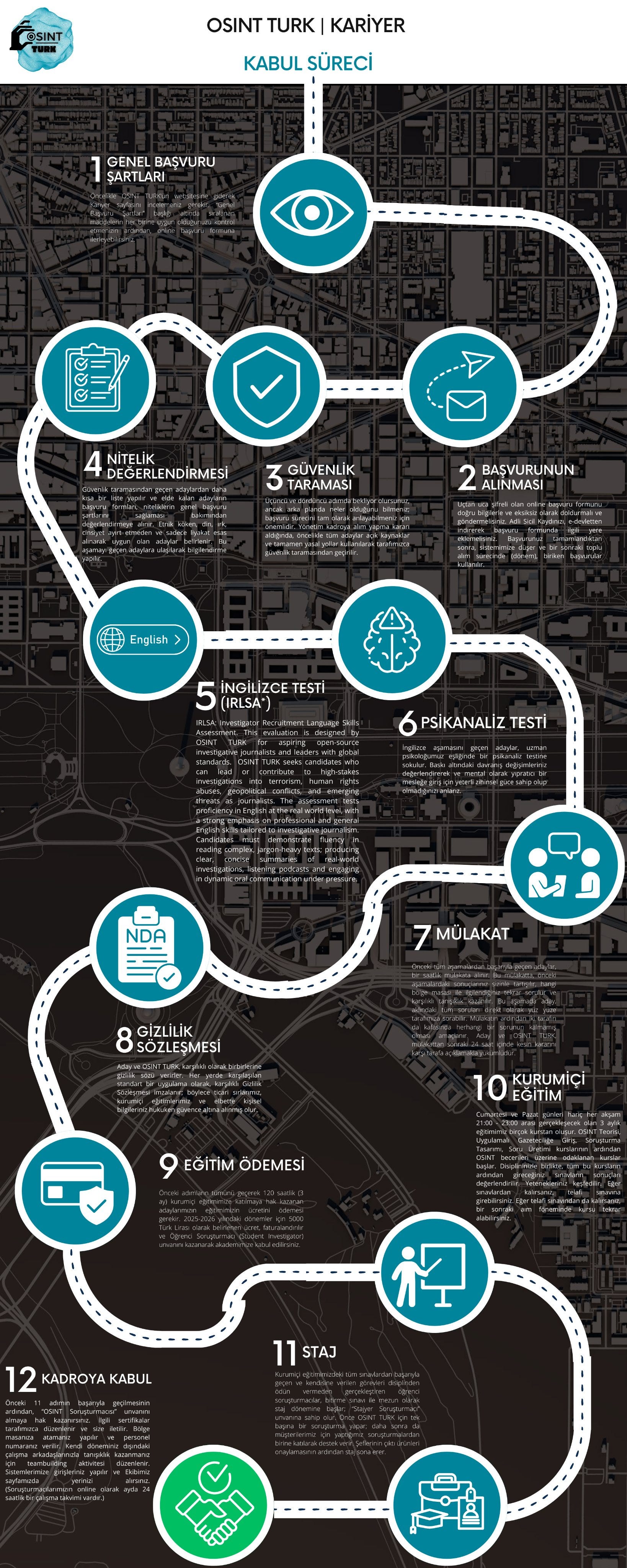 Benzersiz bir eğitimi de içeren 12 adımlı kabul sürecimizi aşağıdaki infografikte inceleyebilir, aklınıza takılan soruları akademi@osintturk.org adresine e-mail göndererek sorabilirsiniz.